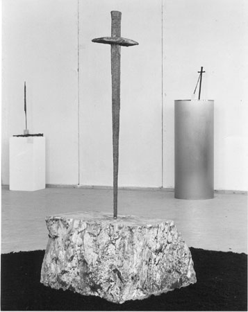 Het zwaard in de steen brons, marmer en turfpulp, cirkel Ø 200cm. zwaard 102x25cm, steen 65x60x34cm, gewicht 300 Kg klik hier voor bijbehorend artikel